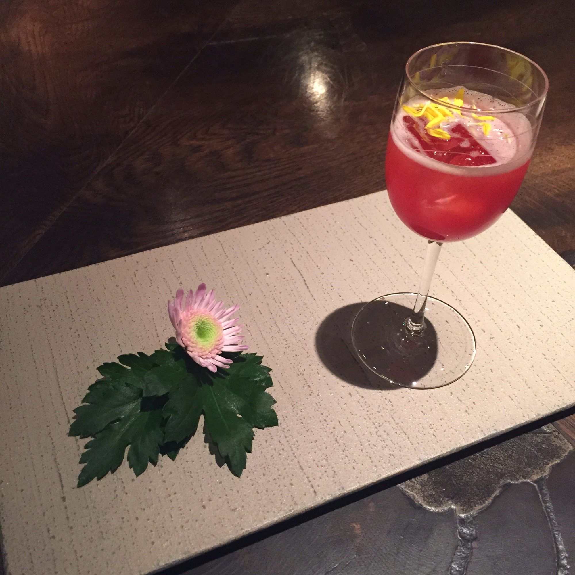 The first drink was extremely refreshing. A mixture of a Japanese type of cherry tomato called aiko mixed with sochu or a Japanese spirit from Iki island, topped with chrysanthemum.